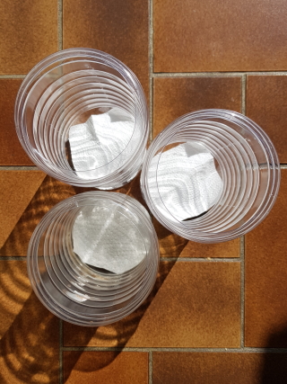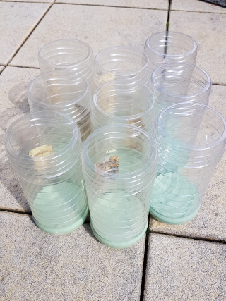 Es gibt viele verschiedene Dosen in denen Drosophila angesetzt werden. Die Bandbreite geht dabei vom Wegwerf-Kunststoffbecher bis zu fast schon professionellen EMSA-Dosen mit eingeschweißter Fliegengaze im Klappdeckel. Ich habe viele Dinge hierbei ausprobiert. Meine Tee-Behälter sind stabil, werden immer wieder ausgewaschen und halten mehrere Jahre. Der Verschluss mit dem Gaze ähnlichen Kittelstoff hat sich bewährt und der Deckel der mit einem Handgriff geöffnet bzw. geschlossen werden kann, ist für mich die praktischste Lösung. Mit Grausen denke ich noch an die Damenstrümpfe die immer im ungünstigsten Moment weg schnipsten oder einfach an meinen rauen Händen hängen blieben.