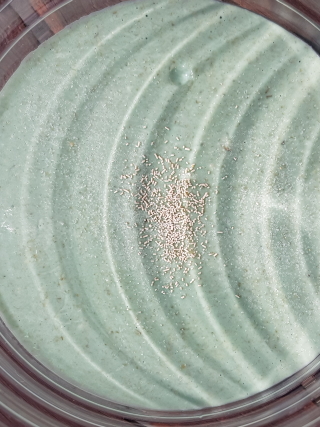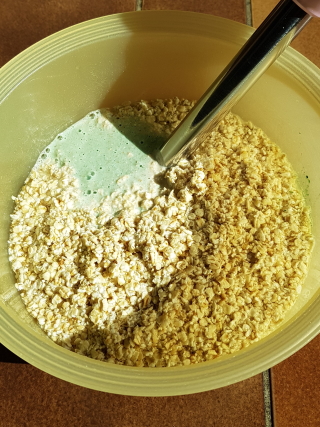 Zuerst kommt das Wasser in die Schüssel. Anschließend folgt das Milchpulver, das Spirulina, die Bierhefe, die Haferflocken und das Salz. Alles wird mit dem Stabmixer gut zusammengerührt. Nach zehn Minuten Standzeit sieht man, ob der Brei zu fest oder zu flüssig ist. In diesem Fall kann man noch etwas Wasser bzw. Haferflocken dazugeben.