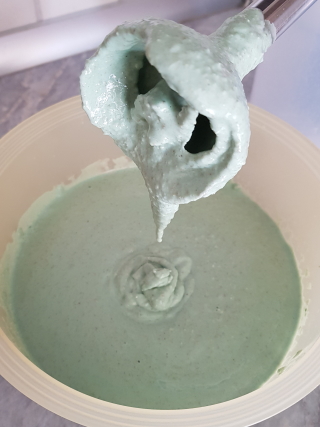 Der angerührte Brei sollte locker-flockig (wie bezeichnet man diesen Zustand?) vom Mixer herunterlaufen. Mit dem Esslöffel werden die Dosen jetzt mit ~130 g befüllt. Das ist für mich der schwierigste Teil da ich dabei immer (vergeblich) versuche, die Ränder der Dosen nicht zu bekleckern. Ich bekomme mit diesen Mengenangaben neun gefüllte Fliegendosen. Für Drosophila hydei kommt etwas mehr Brei ins Glas, da die sich massig entwickelnden Maden in relativ kurzer Zeit sonst den kompletten Vorrat vertilgt haben.
