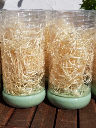Zum Schluss kommt pro Dose die obligatorische "Hand voll" Holzwolle hinein. Es sollte nur soviel sein, damit die Fliegen darin herumlaufen können. Macht man aber zuwenig Holzwolle hinein, fällt das ganze Zeug später beim Herausschütteln der Fliegen mit heraus, was natürlich nicht gewollt ist.