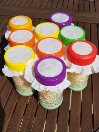 Die Dosen werden jetzt mit dem Kittelstoff abgedeckt und die gelochten Deckeln werden aufgeschraubt. Durch die bunten Deckel sieht das alles jetzt ein bisschen nach Kindergeburtstag aus. Diese verschiedenen Farben kennzeichnen mir aber später das Ansatz-Datum. Dosen mit der gleichen Farbe sind auch am selben Tag mit Fliegen angesetzt worden.